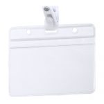 Identificador troquelado en PVC con clip de fijación en color blanco. Disponible en diseño horizontal y vertical.